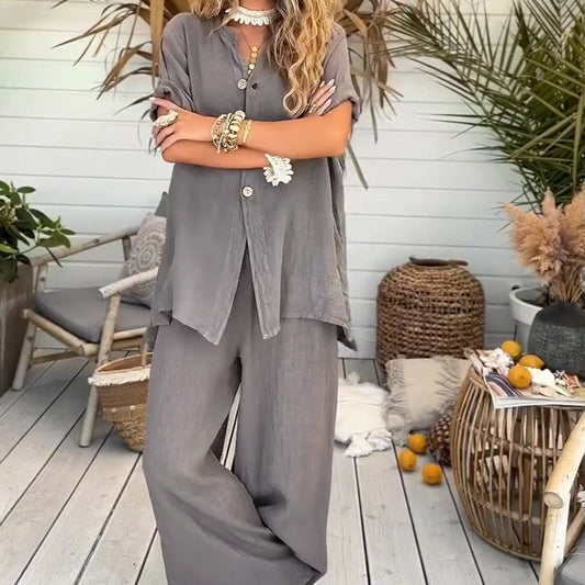 2-teiliges Damen-Set aus einfarbigem, lockerem Kurzarmhemd und weiten Hosen
