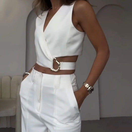 Lässiges 2-teiliges Set für Damen, ärmellose Weste mit V-Ausschnitt und Hose mit weitem Bein