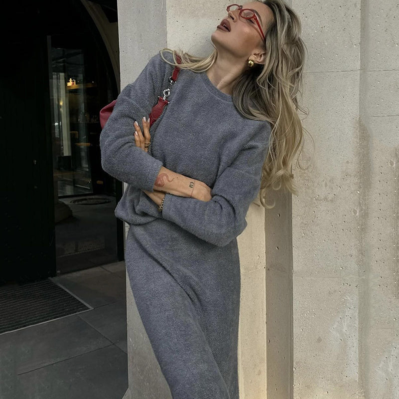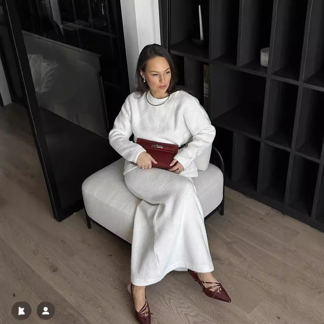 Elegantes, kuscheliges Set aus Pullover und ausgestelltem Rock für Damen
